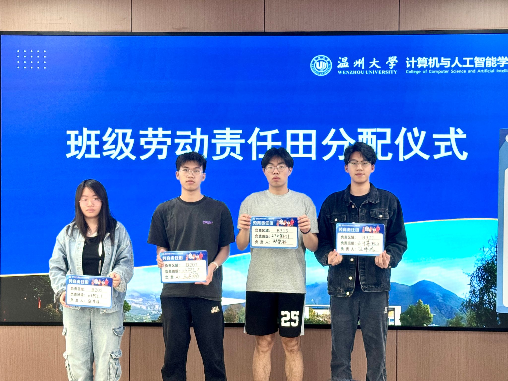 班级劳动责任田分配仪式。各班负责人依次上台签署并领取打扫区域标识和清洁工具,标识明确了班级劳动范围,此举能推动劳动教育从理念意识从走向行动,使同学们清晰知晓班级劳动责任,将责任意识深植心底,后续也将在劳动中担当作为,齐心打造整洁校园环境。
