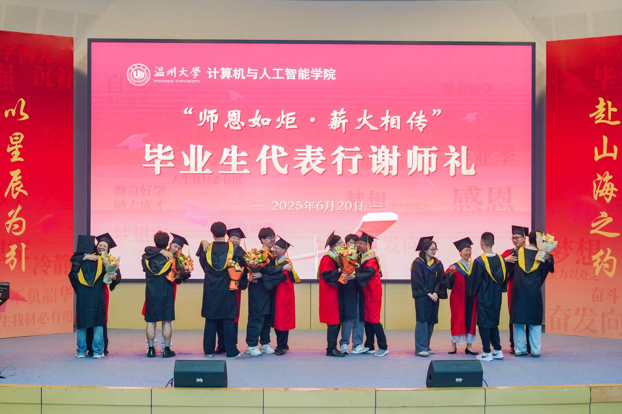 拨穗仪式结束后,毕业生代表向教授、毕业班班主任及各系主任献花致谢,与师长合影定格温情瞬间,师生间温暖的拥抱与灿烂的笑容,无声承载着四年来深厚的师生情谊,成为毕业季里动人的记忆剪影。