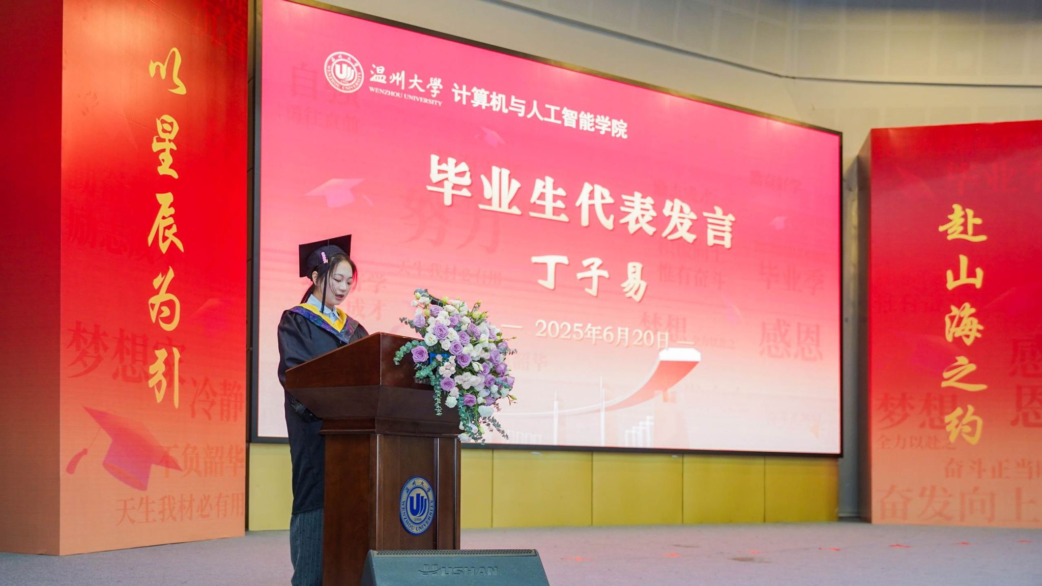 毕业生代表丁子易深情回顾四年奋斗岁月,向恩师们致以诚挚谢意。她坦言,四年求学让自己兼具 “严谨” 品格与 “韧性” 力量,愿2025届毕业生同学们能够成为新一代追光者,在数字浪潮里,以代码为笔、创新为墨,书写属于自己的算法传奇。