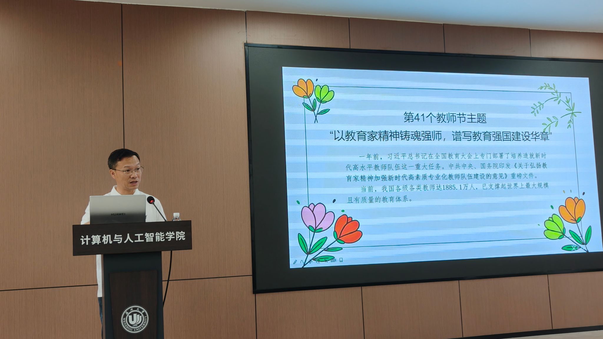 会议伊始,学院党委书记全力向全体教职工致以节日问候,并围绕第41个教师节主题“以教育家精神铸魂强师,谱写教育强国建设华章”进行领学。他指出,要深刻领会教育家精神的核心要义,将其融入教书育人全过程,以1885.1万名教师共同支撑的、世界最大规模教育体系为荣,担当起为教育强国建设贡献力量的时代使命。