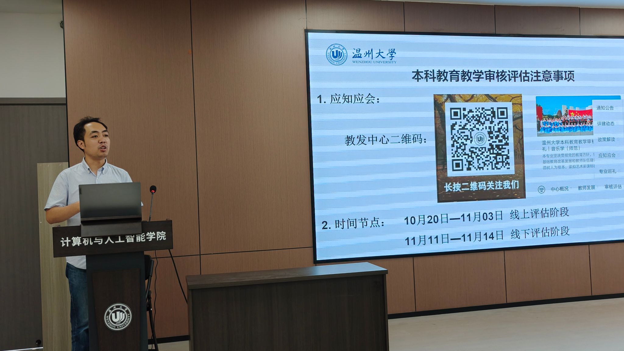 学术副院长张楠就本科教育教学审核评估工作进行部署。他明确指出了教师教学体验调研时间及调查对象,并展示调研二维码,提醒教职工们及时作答;同时详解本科教育教学审核评估事项,指出需掌握“应知应会”内容,线上评估与线下评估将通过审读材料、听评课、座谈等形式开展,要求老师们提前检查材料,确保评估顺利推进。