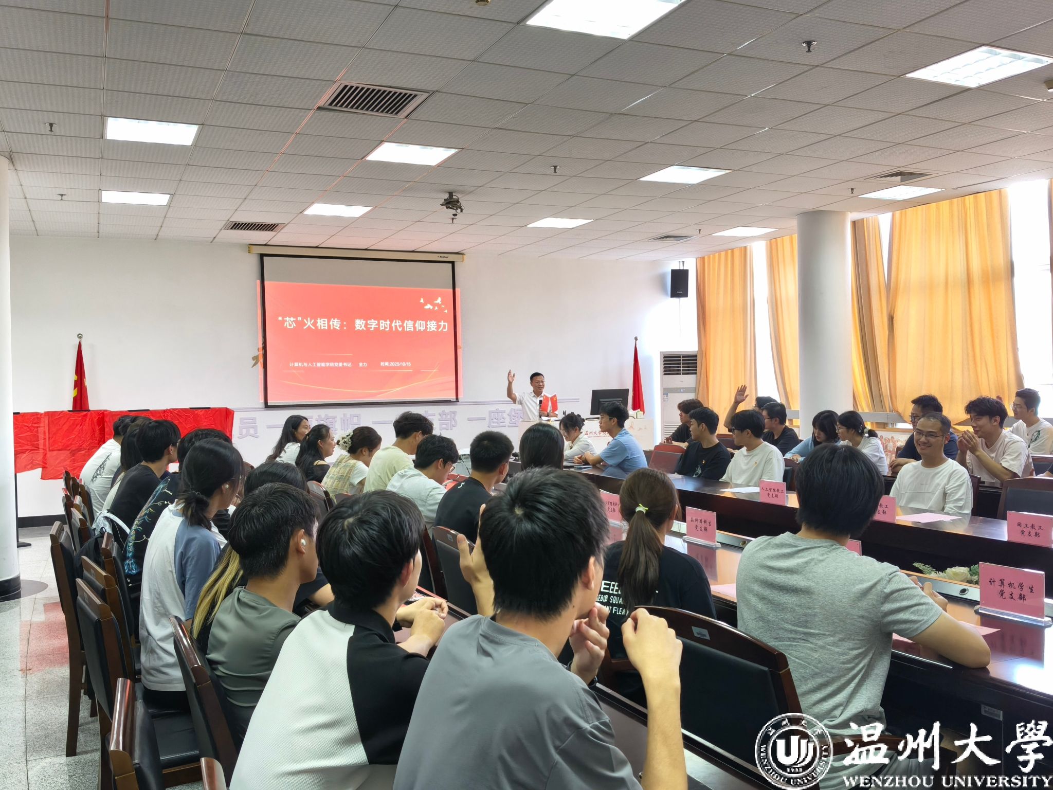 在党员之家,学院党委举办“芯”火相传·领航致远师生党支部结对共建启动仪式,明确四组师生党支部结对关系——计算机教工党支部与计算本科生党支部、网工教工党支部与网工本科生党支部、数科教工党支部与数科本科生党支部、人工智能教工党支部与AI本科生党支部精准对接,为师生协同发力搭建组织框架。 同时,各结对支部结合学科特色,发布“红芯e栈”“数智引航·校地赋能大数据与信息技术研究院”“警校联创·共建鹿城区网络安全实践教育基地”“校地联建·AI领航建设智赋曹村技术服务团”等特色联建品牌,将党建工作与专业实践、校地合作深度绑定,推动党建成果转化为育人实效与服务社会的动力。全体师生党员面向鲜红党旗肃立,举起右拳庄严宣誓:“我志愿加入中国共产党,拥护党的纲领,遵守党的章程……”铿锵有力的誓言响彻会场,不仅是对入党初心的重温,更是对使命担当的再承诺。