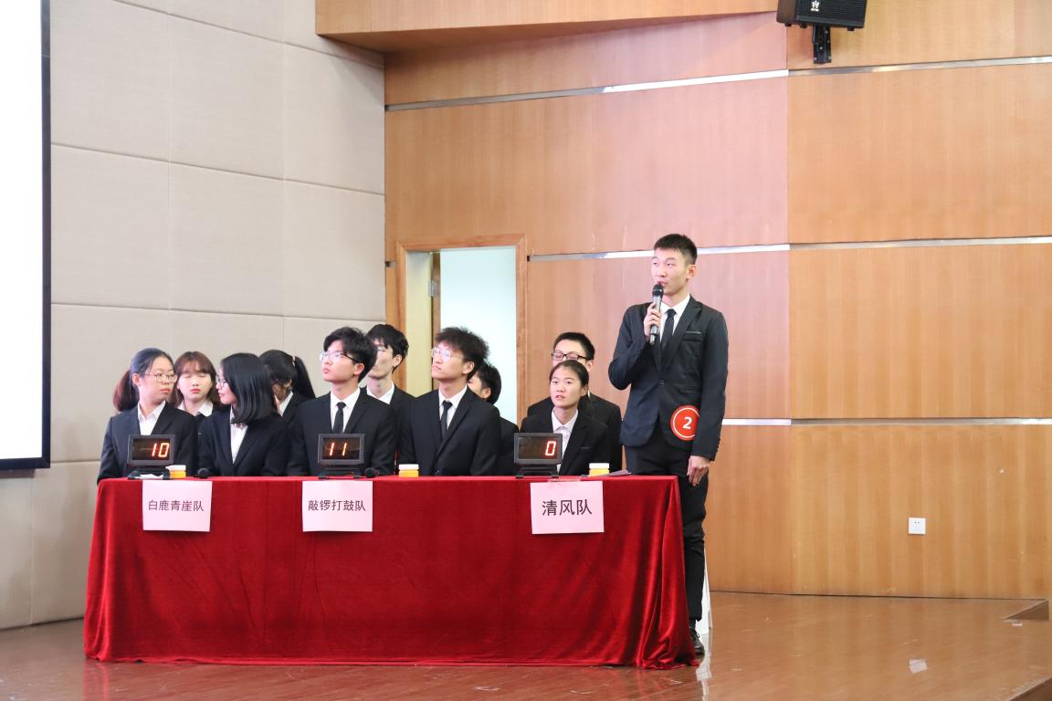 参加本次决赛的六支队伍由初赛选拔产生,分别是鲲鹏队、正在向我们走来队、温韵风清队、清风队、敲锣打鼓队、白鹿青崖队,共24名选手参加。决赛由“志在必得”、“舍我其谁”、“绝地反击”、“步步为营”和“锋芒毕露”五个环节组成。主持人简单介绍完比赛规则后,比赛正式开始。首先进行的是必答题,从《关于严明党的纪律和规矩论述摘编》到党章,从党的基本理论到党的纪律,选手们运用自己所积累的知识,奋力答题,彰显党员风采。在抢答题环节,各队选手争分夺秒,在拼手速的环节上互不相让,他们聚精会神听题,沉着冷静答题。现场观众们也不禁为场上的情势屏息凝视、为选手们加油鼓气。在竞赛之余,现场通过观众互动答题的形式,调动观众们的积极性,现场气氛一片火热。在风险题这一环节,充满了惊险与反转。多个队伍试图让其他队伍答题以期拉开分数差距,却在“运气”和“实力”中双双落败,反而使得场上分数差距越来越大。在“步步为营”这一主观题环节中,通过漫画和视频两种题型,不仅考验选手们的综合素质,更是考验选手们理论联系实际的问题解决能力。为了使比赛的气氛更加浓厚,充分调动全场的积极性,本次大赛还设计了“观众互动——红歌我来猜”环节,以6首红色歌曲激发学生们的爱国热情,熟悉的旋律刚一响起,台下便一片沸腾,观众冲上舞台,唱响爱国之情。