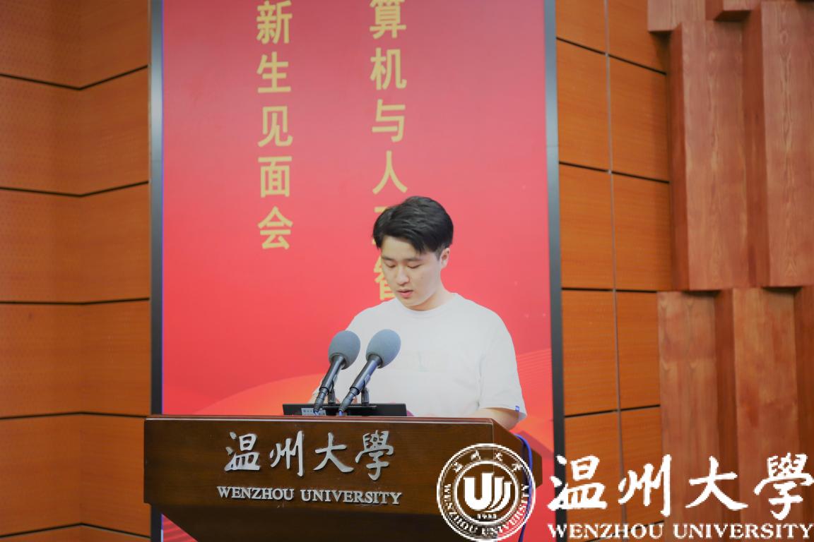 随后,17计算机2班陈凯强作为优秀学生发表发言。在这个特别的时刻,他就自己大学三年学习生活与新生们分享了快乐大学的三个锦囊。首先,信念为标,决胜未来。做好未来人生规划,明确自我认知和定位,在实践活动中冲破信息茧房;其次,保持自律,宁静致远。做时间的主人,不蹉跎这四年青葱岁月;最后,群居不倚,独立不惧。学会自我适应,学会沟通和宽容。最后,他希望同学们可以着手参加学生组织与各类社科比赛,在实践中锻炼自己,成为德才兼备的“计智人”。