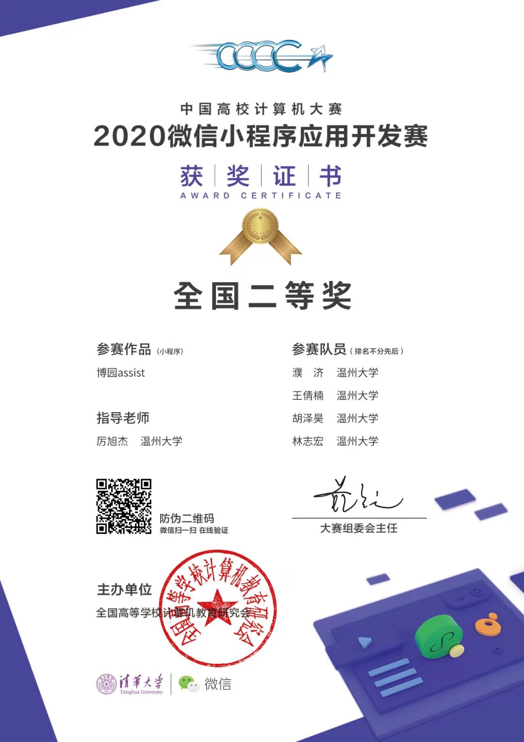8月15-16日,“2020中国高校计算机大赛——微信小程序应用开发赛决赛”全国总决赛圆满落幕。来自全国七大赛区15252人、4314支队伍经过激烈的角逐,最终由32支队伍入围全国总决赛。我校beat365在线唯一官网厉旭杰老师指导的濮济、王倩楠、胡泽昊、林志宏四位同学组成的学生团队“ping队”,在比赛中沉着应战,科学决策,凭借“博园assist”项目斩获全国总决赛二等奖的优秀成绩。