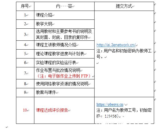 2021-2022-2学期课程结束后,请将本科课程教学档案上传到beat365在线唯一官网课程档案系统(http://ai.3enetwork.cn/,课程教学档案清单详见表1),其中,电子版作业上传到/index.html的“2021-2022-2课程作业”文件夹中(命名格式:班级+课程名+姓名),纸质版作业每个评分等级各交2份到教务科胡孙贵老师处;课程达成评价报告需登录毕业要求达成度评价系统(https://obesys.cn,操作手册详见附件2)进行填写,所有材料上传截止日期:2022年7月30日。