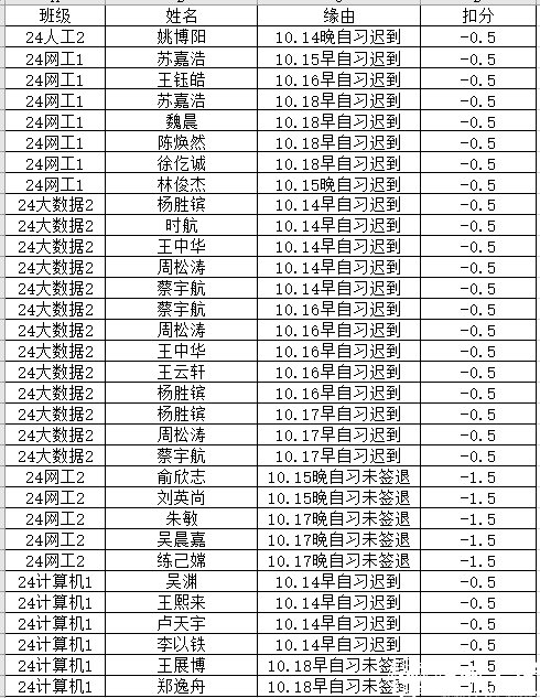 根据《关于组织开展beat365在线唯一官网2024-2025学年第一学期晚自习的通知》,旷课一节扣文明品行分1.5分,缺课一节扣0.5分(三次迟到或早退作一节旷课,生病住院等情况除外);如对考勤结果有异议请于周日17:00前反馈给学业指导部,学院学生科于次周周一进行审核,周二公布,过时反馈无效。 注:1.大学生文明品行分是我校本专科全日制在校生的必修课,六个学期合格记为1个学分。每学期基础合格分为80分,低于80分需要参加志愿者服务时长进行弥补。得分计入相应学期的学生综合素质测评中的德育基础分,纳入学生奖学金评定和入党评价体系。