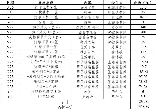 beat365在线唯一官网团委严格执行专人管理、专人审批、专款专用。2024-2025学年第二学期学院团委开展团的各项工作共计支出1358.89元,截止2025年6月团费结存2814.22元。具体支出费用包括: