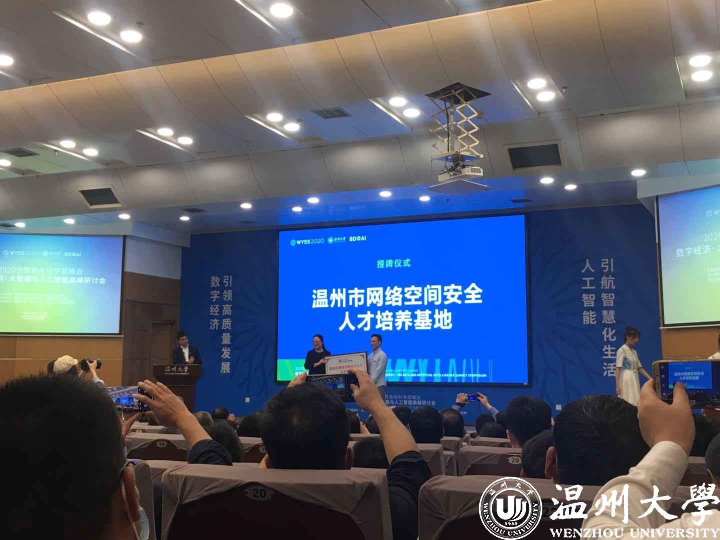 研讨会上还举行了多个平台的揭、授牌和签约仪式。市委宣传部副部长、网信办主任、市委副秘书长王丹、温州市发展和改革委员会副主任汪浩分别为“温州网络空间安全人才培养基地”、“浙南(温州)数字经济产教融合联盟”授牌。源于去年青峰会“大数据与人工智能论坛”的成果正式落地,浙南(温州)数字经济产教融合联盟成立,不单是温州各高校、数字经济骨干企业及行业协会共同努力的成果,也承载着政府部门的期待,联盟将为推动做大做强浙南地区数字经济发展做出更大的贡献。