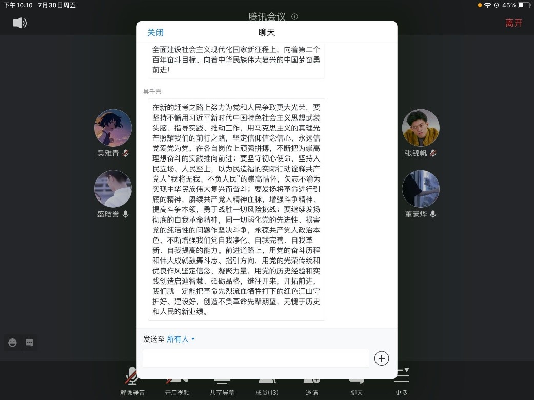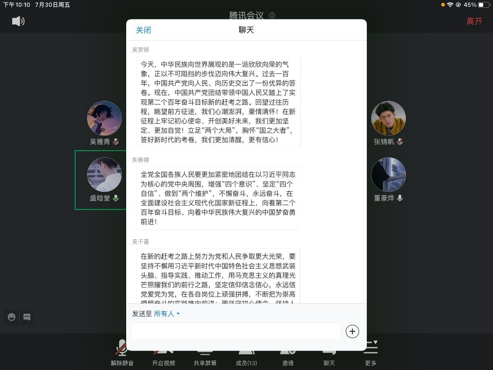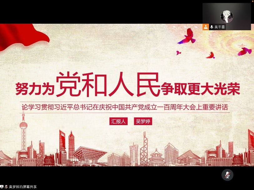 2021年7月1日,我们迎来了建党100周年华诞,习近平总书记在庆祝中国共产党成立100周年大会上发表了重要讲话,向世界宣示了坚持和发展中国特色社会主义的坚定决心。2021年7月30日晚,beat365在线唯一官网本科生第一党支部召开了由吴梦婷同学主持的学习会,学习习近平总书记此次重要讲话,共有4名正式党员和10名预备党员到会。